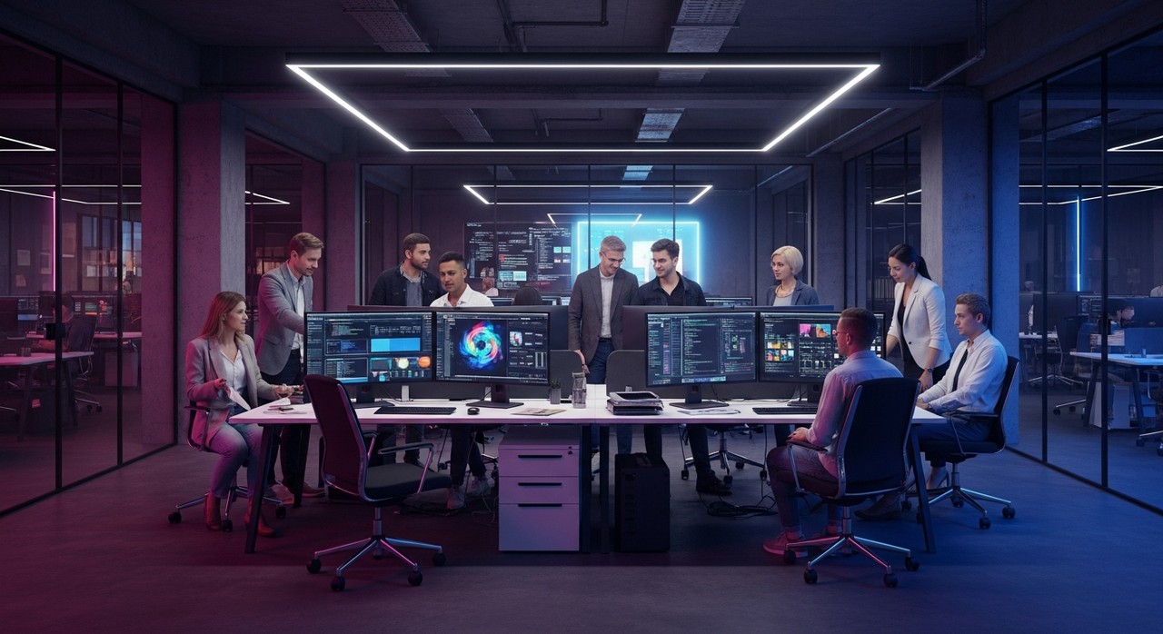 Di sinilah sihir terjadi. Bukan di gedung pencakar langit yang kaku, tapi di ruang kerja kolaboratif dimana Developer, Desainer, dan AI Specialist duduk satu meja memecahkan masalah Anda.